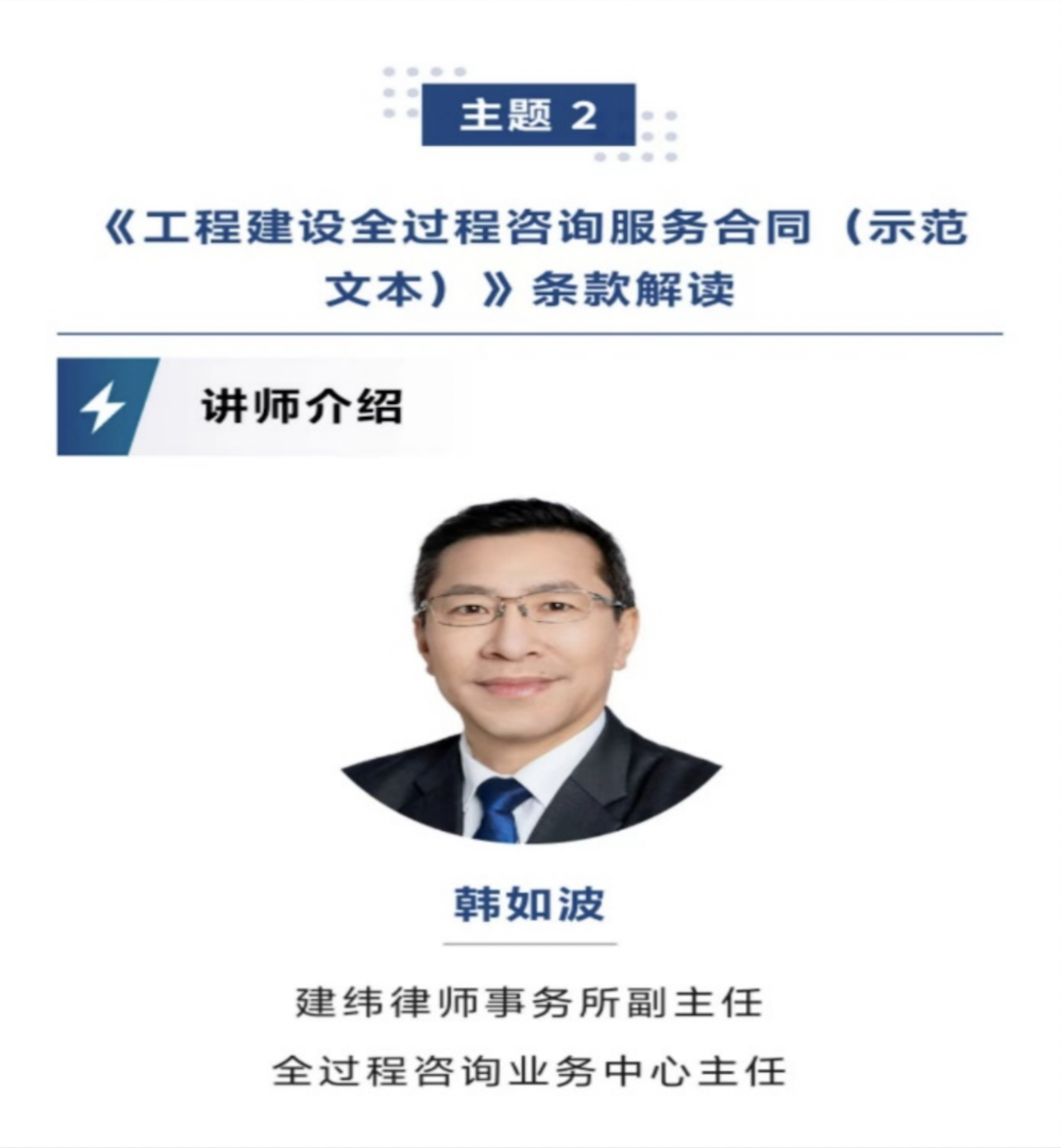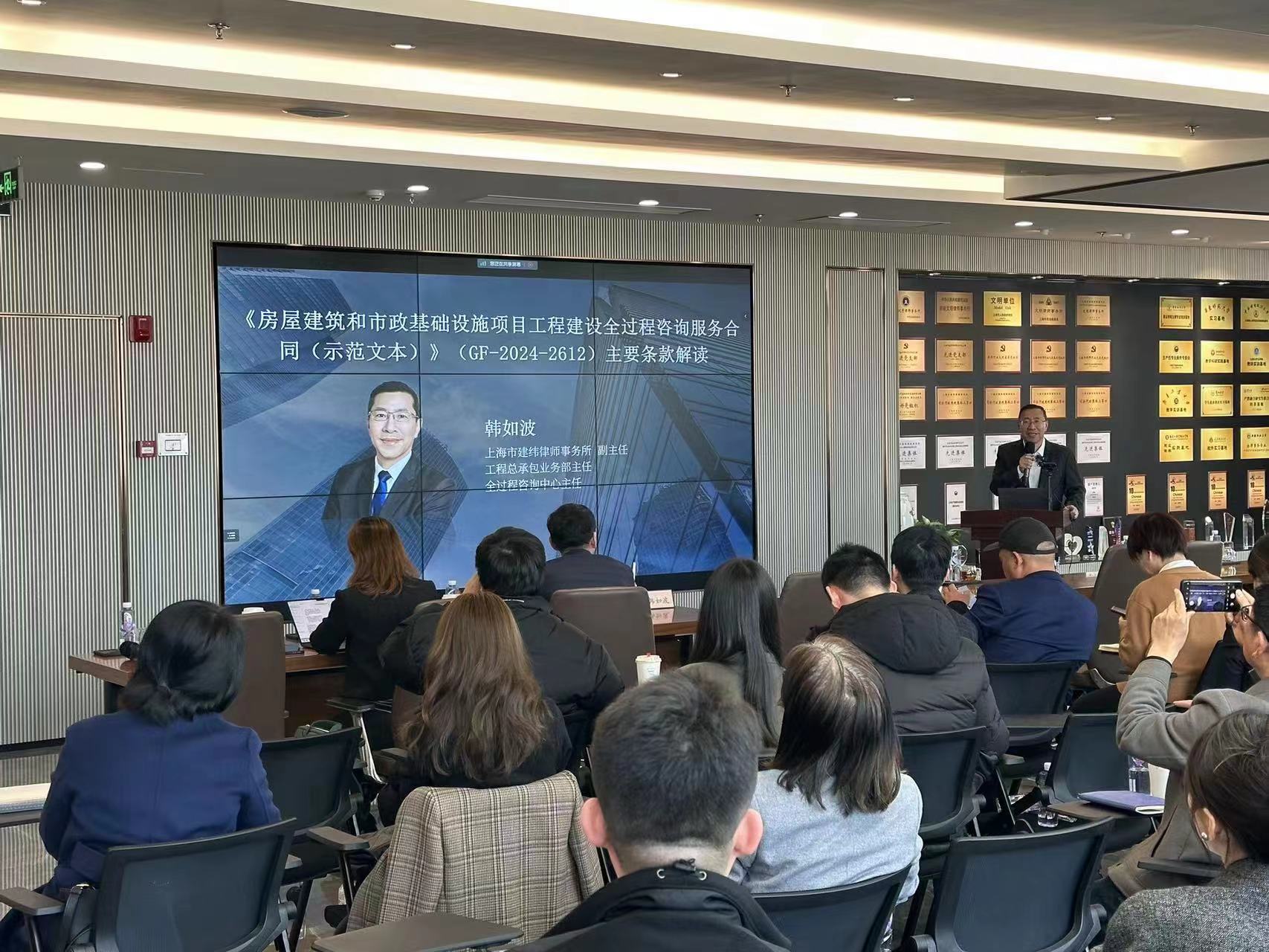本次培训首先由上海市律师协会会长邵万权先生致词,随后全程分享了既有理论高度、又有案例经验的两场精彩演讲,具体由建纬研究院院长朱树英主讲“《工程建设全过程咨询服务合同(示范文本)》的法律适用与实务问题”,由建纬律师事务所副主任、全过程咨询业务主任韩如波主讲“《工程建设全过程咨询服务合同(示范文本)》条款解读”。公司通过腾讯视频链接,同步组织全员参会。