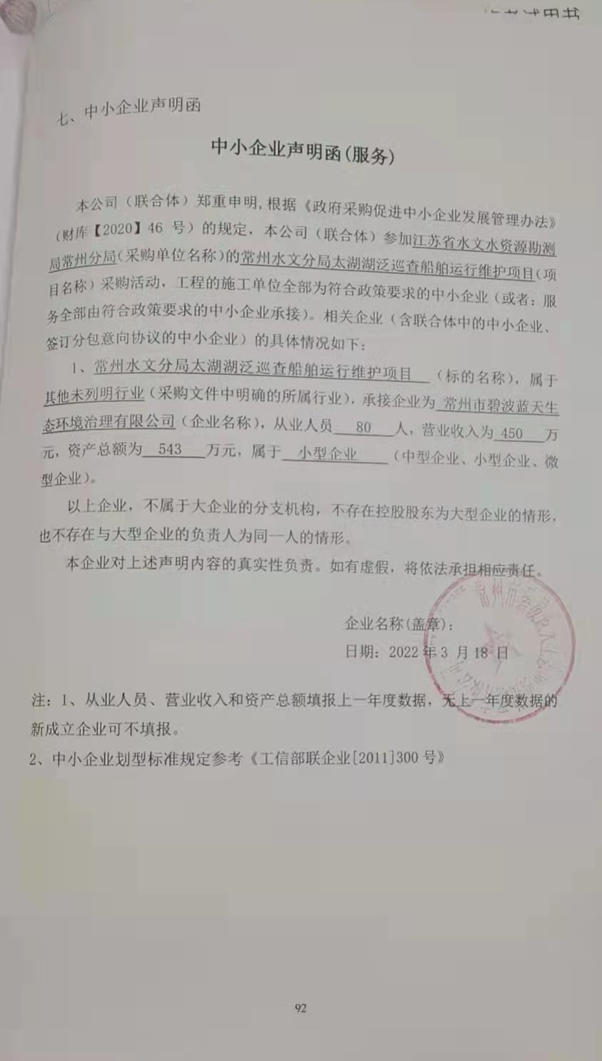 供应商名称: 常州市碧波蓝天生态环境治理有限公司