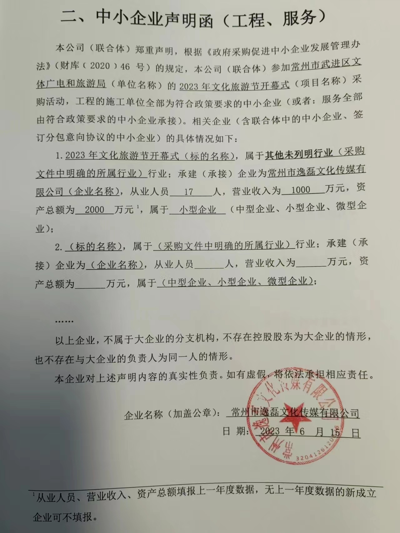 名称:2023年文化旅游节开幕式 服务范围:2023“花都水城·浪漫武进”文化旅游节开幕式策划及实施 服务要求:结合武进文旅发展方向、思路及定位,以文化旅游节为媒,重点宣传和推广“花都水城·浪漫武进”品牌。根据项目要求提供主场活动的创意策划方案和氛围布置方案,并负责方案的组织实施。 服务时间:活动计划开始时间为2023年7月中旬,具体活动时间节点以采购人通知为准。 服务标准:满足采购文件及采购人要求。 |